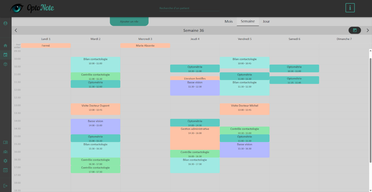 Gérez vos rendez-vous d’optométrie, de contactologie ou de suivi patient depuis un seul calendrier.
