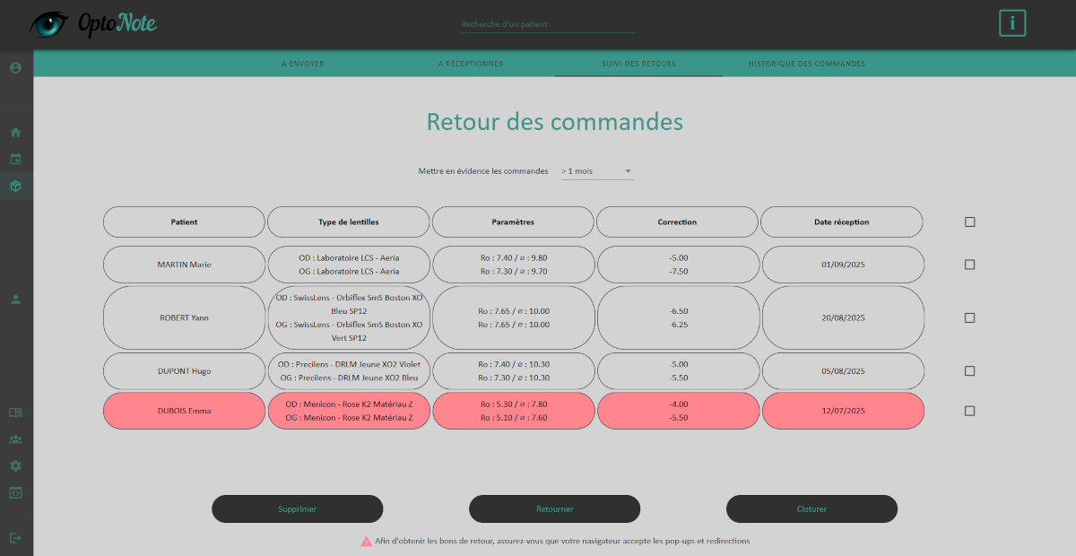 Simplifiez le suivi de vos commandes de lentilles. OptoNote vous permet de créer, suivre et archiver chaque commande en quelques clics.